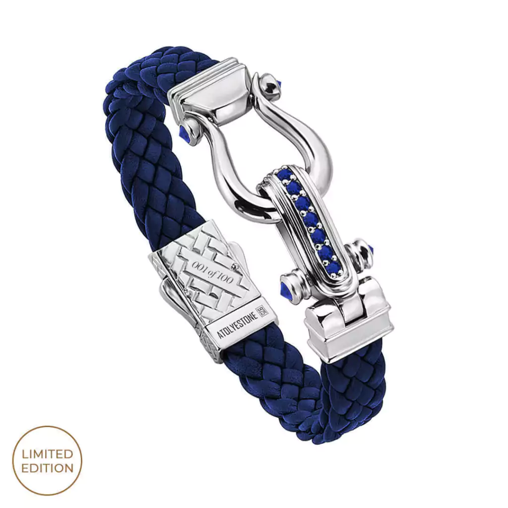 Crie uma aparência poderosa com o design azul de edição limitada da pulseira de couro icônica Atolyestone. Dê um toque característico ao seu estilo com o fascínio do azul. Esta versão de edição limitada é confeccionada em couro italiano azul e decorada com safiras genuínas para elevar seu estilo a níveis de refinamento incomparáveis.