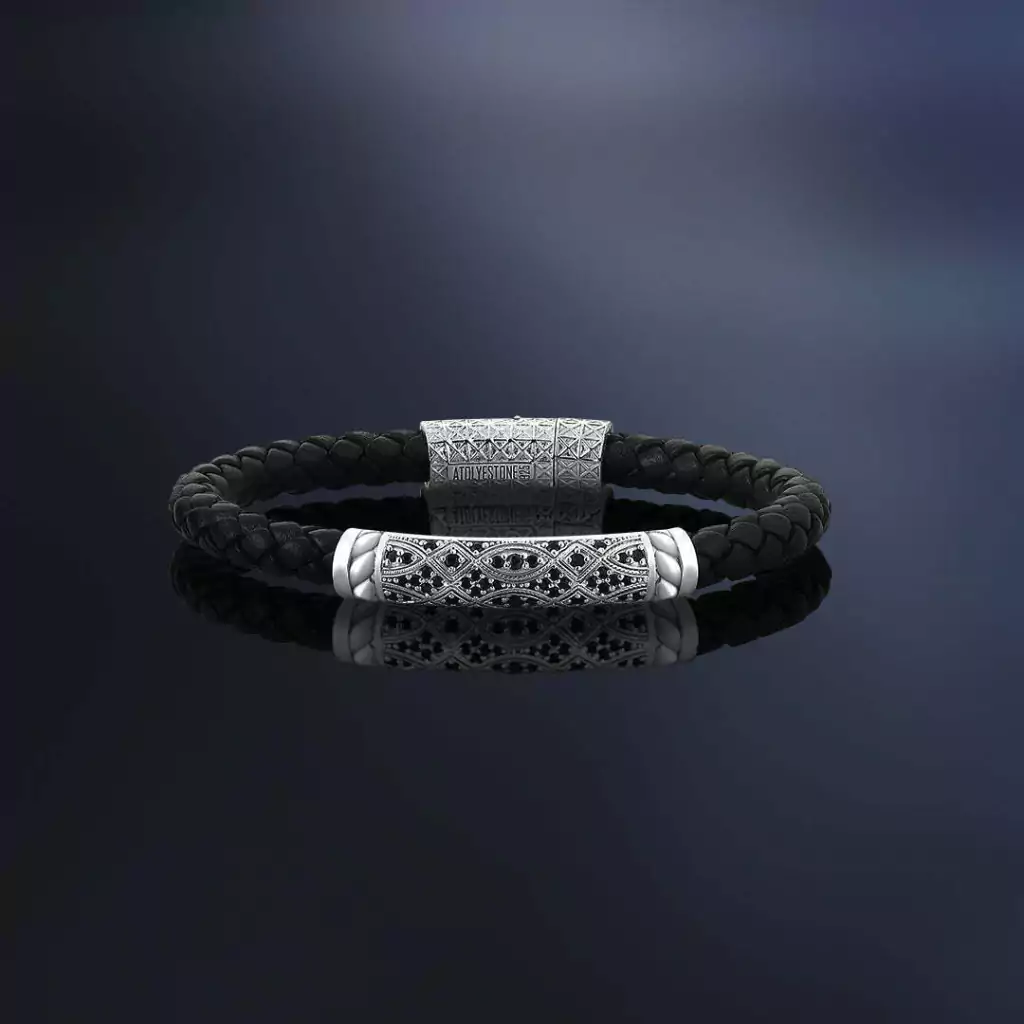 Atolyestone Streamline Braided Leather Bracelet. The strong 6mm braided Nappa is perfectly combined with the powerful and impressive design of streamline on 925 sterling silver decorated with handset Cubic Zirconia stones. This exclusive bracelet is handmade and a great addition to your outfits.